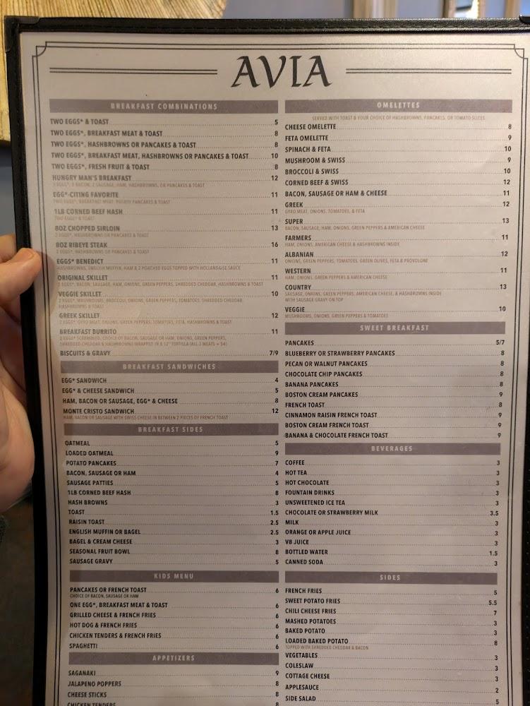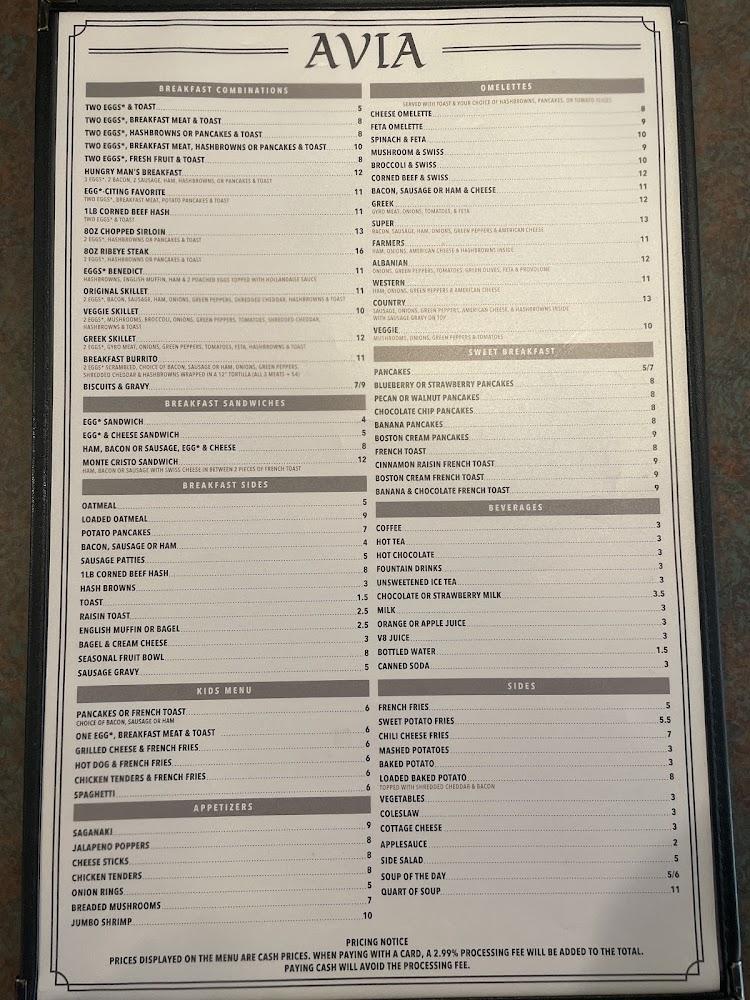 The menu at Avia Family Dining is a delightful array of traditional favorites and unique offerings. Breakfast items like omelets, sandwiches, and breakfast burritos cater to all preferences. The lunch and dinner sections feature hearty burgers, pitas, and fresh salads.